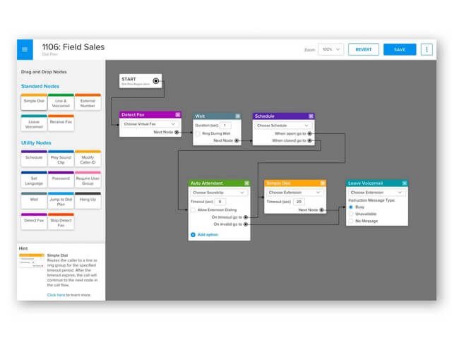 Não é necessário recorrer a um técnico para gerenciar sua configuração de chamada, você pode fazer isso facilmente online esteja onde estiver, sem as complicações de sistemas de telefonia tradicionais. Use nosso editor visual do plano de discagem para fazer mudanças em tempo real e mapear os fluxos de chamada com tempos de espera, atendente virtual, caixas de correio de voz e calendários. Ele apresenta uma interface de arrastar e soltar para uma visão clara de tudo, facilitando a compreensão e a mudança em tempo real.